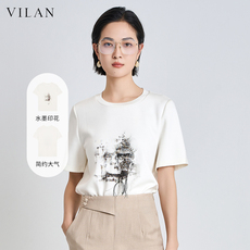 玉兰悠悠春夏"弹力缎真丝"T恤印花短袖圆领新中式上衣短袖女