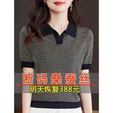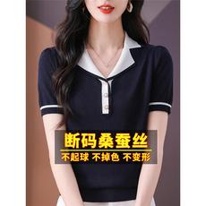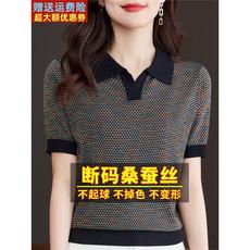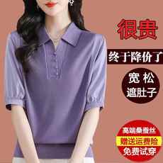 2025夏季新款桑蚕丝短袖t恤女翻领冰丝针织妈妈真丝上衣polo小衫