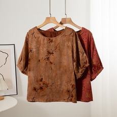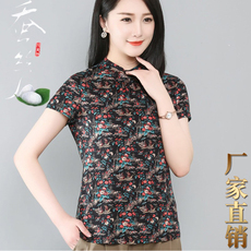 高端真丝上衣女短袖立领夏印花大码胖妈妈100%桑蚕丝针织T恤厂家