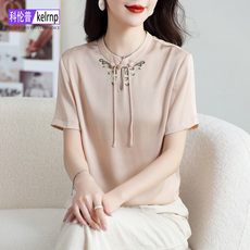 夏季新款高端桑蚕丝短袖t恤女妈妈绣花上衣宽松遮肚洋气真丝小衫