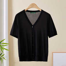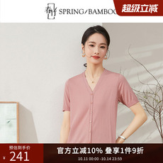 春竹短袖25夏季新款V领薄款透气开衫纯色简约针织衫上衣女冰丝T恤