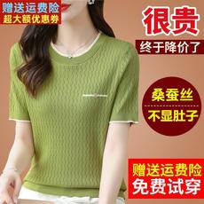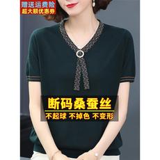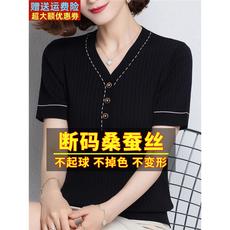 2024夏季薄款桑蚕丝短袖t恤女v领宽松冰丝针织衫真丝短款妈妈上衣