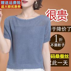 夏季新款款真丝短袖t恤女夏妈妈桑蚕丝小衫一字肩冰丝针织上衣薄