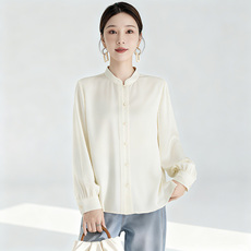 一丝牵 国风100%桑蚕丝素绉缎立领真丝长袖衬衫女缎面衬衣2025秋