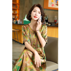 新款双绉真丝连衣裙女妈妈透气时尚气质桑蚕丝印花显瘦裙子夏季