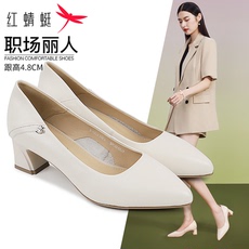 红蜻蜓女鞋2025夏季真皮尖头浅口单鞋女粗中跟舒适通勤职场工作鞋