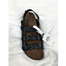 外贸原单真皮大码平底凉鞋女平跟厚底圆头复古一字扣带包头罗马鞋