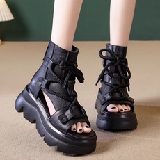 欧洲站真皮增高8CM鱼嘴凉鞋女夏牛皮粗跟凉靴马丁靴学院高帮女鞋