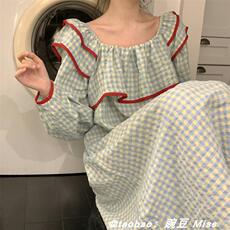 韩版ins甜美荷叶边长袖睡裙女春秋撞色格子简约睡衣可外穿家居服