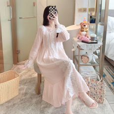可爱公主风蕾丝蝴蝶结纯棉带胸垫睡裙长袖睡衣女春秋款外穿连衣裙