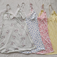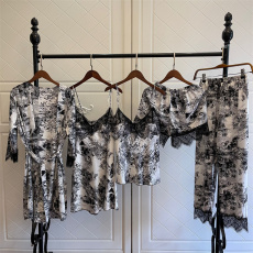 春秋季新款性感睡衣女印花蕾丝吊带睡裙五件套宽松舒适家居服套装