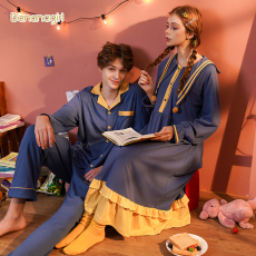 WALKING 公主风条纹情侣睡衣春秋季纯棉纱布长袖套装家居服睡裙女