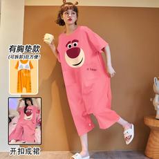 草莓熊连体睡衣女夏季纯棉带胸垫短袖宽松睡裙可爱少女胖MM家居服