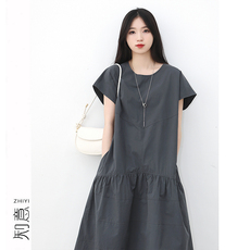 知笔墨夏原创复古文艺植物草木染渐变苎麻连衣裙 圆领抽褶长裙女