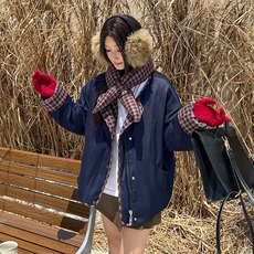 韩系休闲羽绒棉服女短款2025新款棉衣格纹围巾拼接牛仔棉袄外套潮