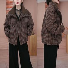 MINI老江 温莎小姐格纹绗棉丝绒棉服短款保暖通勤棉衣外套女上衣