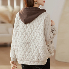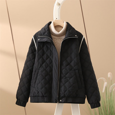 2023年春秋新款棉服女短款轻薄无领日系菱形格棉袄休闲潮外套
