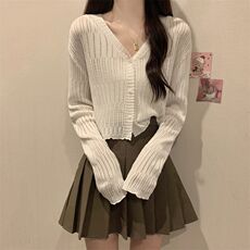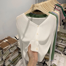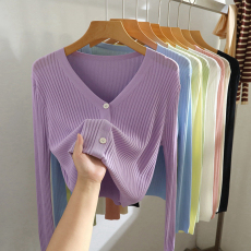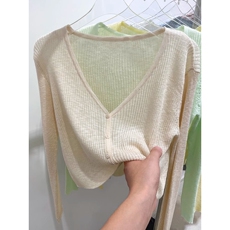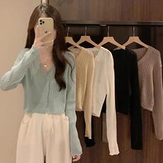 夏季新款V领防晒衣长袖冰丝针织衫修身短款开衫外套上衣女装