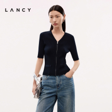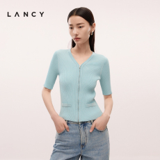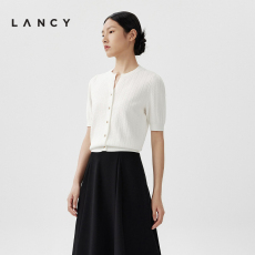 LANCY/朗姿2024夏季休闲百搭短袖针织开衫女短款时尚修身气质上衣