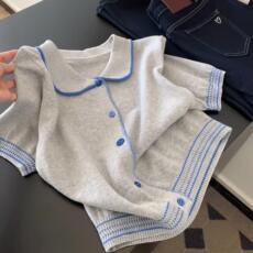 韩国灰蓝撞色polo翻领针织开衫女夏季新款小个子正肩短款短袖上衣