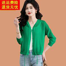 桑蚕丝连帽针织衫女冰丝小开衫外搭披肩短款夏季防晒外套绿色外衣