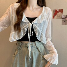 镂空系带短款长袖防晒针织开衫女夏季薄款V领别致披肩罩衫小外搭