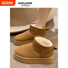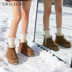Grace gift真皮雪地靴女冬季短筒厚底毛毛鞋加厚加绒保暖防滑棉鞋