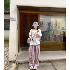 2025夏季新款字母印花粉色小清新短袖T恤女韩版宽松简约短袖T恤女