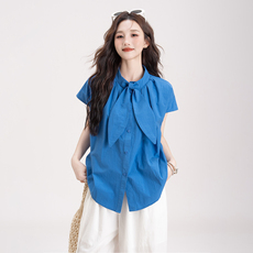 克莱因蓝夏季短袖衬衫女2025新款蝴蝶领结设计感韩系独特气质上衣