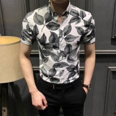 植物树叶印花短袖衬衫男夏季高级时尚痞帅修身休闲衬衣商务男装寸