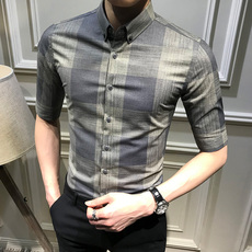 新款夏季短袖格子衬衫男士修身开衫上衣青年帅气休闲男装中袖衬衣