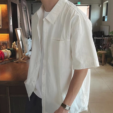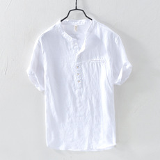 韩系棉麻皱布白衬衫男文艺范修身短袖亚麻透气休闲工装衬衣薄外套