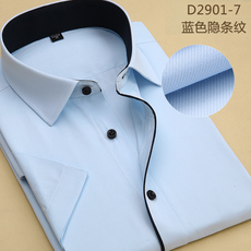 短袖白衬衫夏季纯棉男士衬衣加大码条纹修身职业工装商务正装蓝色