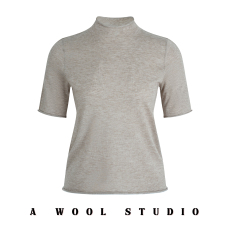 卷边半高领精纺羊毛中袖体恤春夏新款女套头纯色百搭针织打底短袖