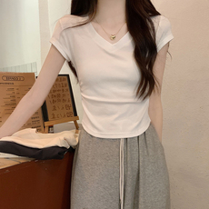 纯棉v领短袖t恤女夏纯色修身显瘦短款正肩辣妹上衣夏日多巴胺穿搭