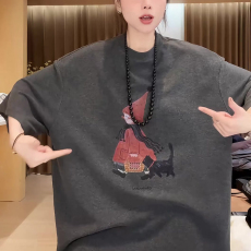 卡通印花短袖磨毛纯棉T恤春秋大码宽松圆领百搭叠穿上衣