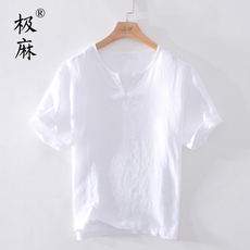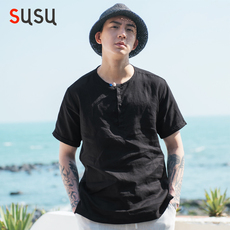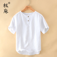 极麻盘扣圆领大码短袖亚麻T恤男士日系休闲透气文艺宽松棉麻汗衫