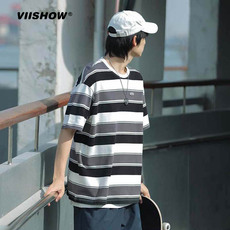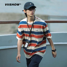 VIISHOW2023春夏新款cityboy日系宽松t短袖T恤撞色条纹情侣短t男
