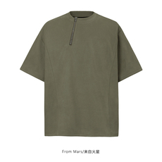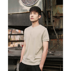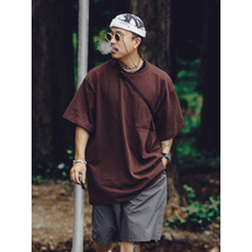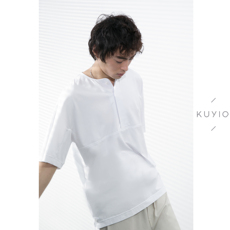 KUYIOU夏/半开襟圆领 高低下摆分割日系宽松连肩袖纯棉短袖T恤男