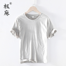极麻日系复古圆领套头短袖亚麻T恤男士休闲宽松青年舒适棉麻汗衫