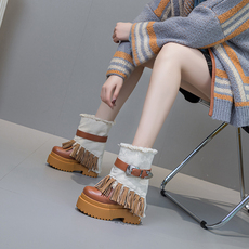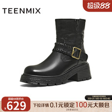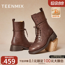 天美意复古西部靴加绒骑士靴女鞋子厚底马丁靴短靴皮靴冬新款