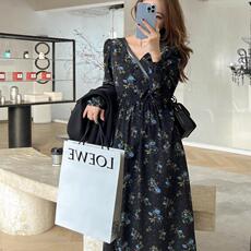 黑色碎花连衣裙2021年新款女春秋D季收腰气质长款长袖雪纺长裙早