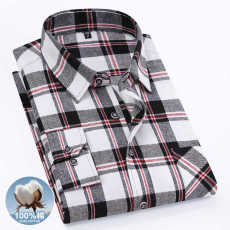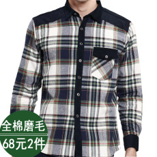 春秋款100%纯棉磨毛格子男士衬衫男长袖宽松口袋休闲商务全棉衬衣