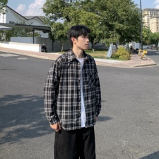 春季新品日系复古男士休闲宽松双口袋磨毛全棉格纹长袖衬衫衬衣潮