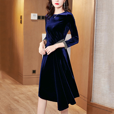 菲梦伊钉珠蓝色金丝绒连衣裙女冬季复古洋气收腰中长款打底裙礼服