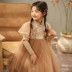 童改良版中国风2025冬季新款中大童中长款亮片加绒礼服旗袍连衣裙
