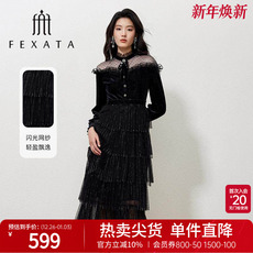 FEXATA斐格思2025冬季新品中长款蛋糕礼服丝绒小黑裙网纱连衣裙