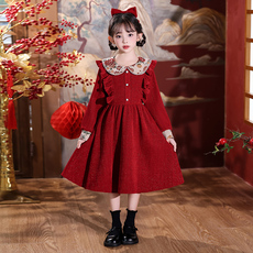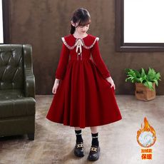 红色裙子女童连衣裙加绒收腰小香风女大童秋冬长裙女孩长袖公主裙