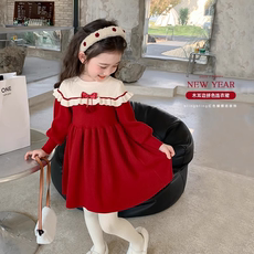 拉比童装女童裙子长袖儿童连衣裙红色2025秋冬新款宝宝休闲裙子