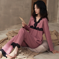 睡衣女士秋冬季长袖纯棉蕾丝花边家居服春秋款大码可外穿薄款套装
